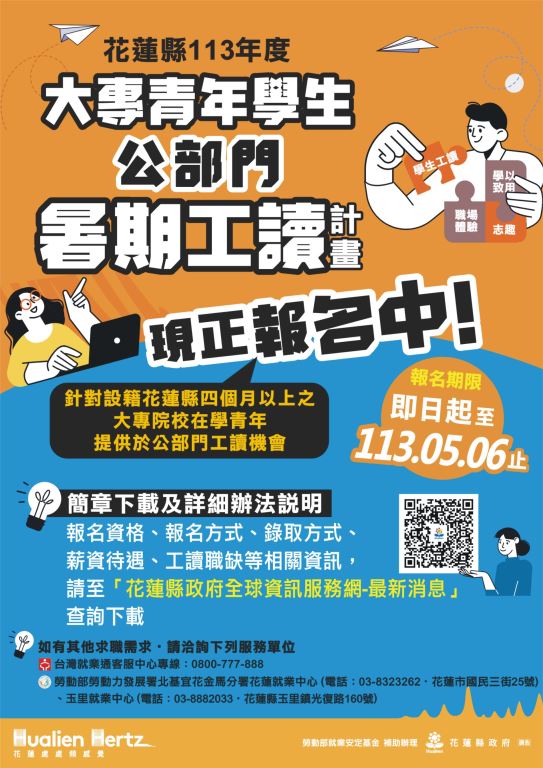為使青年能於在學期間即了解政府組織運作方式、工作內容、組織文化及公共政策形成、制定、執行過程,鼓勵青年參與公共事務,學習政府運作機制,以利規劃未來職涯發展,特別針對設籍本縣之在學青年提供於公部門工讀機會。 報名時間:即日起至113年5月6日止(郵戳為憑) 旨揭計畫適用對象如下: (一)設籍本縣:設籍4個月以上,以113年4月1日前計算 (二)國內各大專院校一年級以上及研究所一年級升二年級之在學學生 本計畫報名資格及注意事項詳參報名簡章、報名表件及工讀職缺,可至本縣全球資訊服務網最新消息(http://www.hl.gov.tw)下載 新聞照片