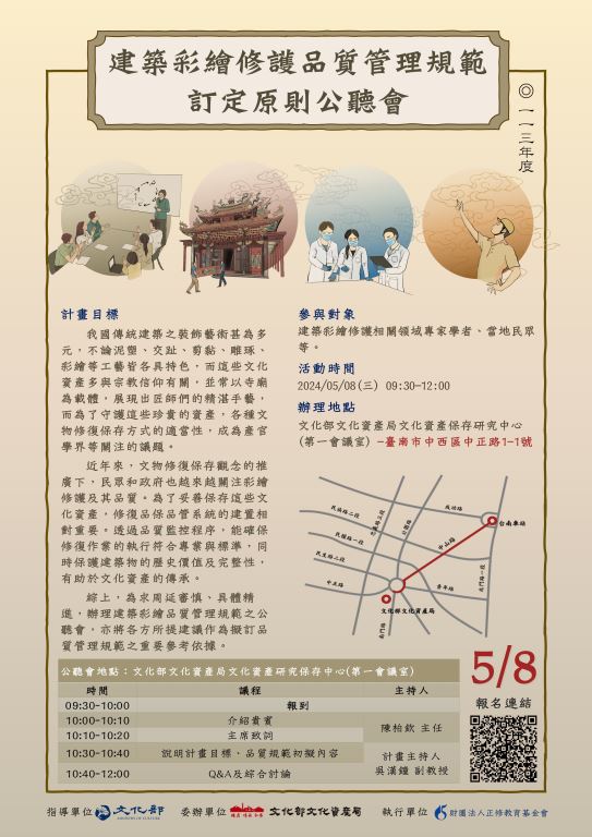 文化部文化資產局辦理「建築彩繪修護品質管理規範」訂定原則公聽會,邀請相關專家學者及關心彩繪修護民眾參與,公聽會資訊如下: (一)時間:113年5月8日(三)上午9時30分至12時。 (二)地點:本局文資中心第1會議廳(臺南市中西區中正路1-1 號)。 (三)對象:建築彩繪修護相關專家學者及關心臺灣建築彩繪 修護的民眾。 (四)報名連結:https://reurl.cc/0vjLa9。 附件檔案 公文(.pdf) 議程(.pdf) 新聞照片