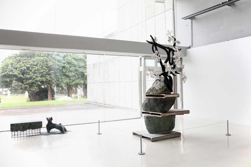 本次亮點藝術作品由質物霽畫主理人、家鄉也在花蓮的藝術家李霽創作,其大型裝置作品《Touch》與昌展石業的山形蛇紋石結合。山形蛇紋石來自花蓮公園常見的蛇紋石石桌、石椅的半成品,以堆疊方式與藝術作品結合,呼應玻璃窗外樹景、海景、大型石雕作品,寓意石中迸出生命的意象。另外,同時在落地窗前展出由花蓮縣萬榮鄉、德魯固族在地石雕家劉金德的《展望》創作的臺灣土狗。