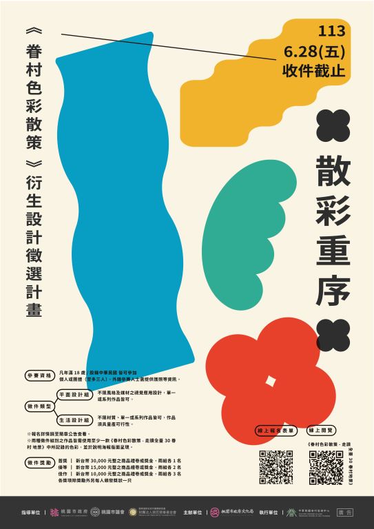 桃園市政府文化局以《眷村色彩散策-走讀全臺30眷村地景》一書所記錄之色彩素材為基礎,為讓眷村的色彩重新編織、交集、揮灑出新的生命與想像,規劃旨揭活動,報名時間自即日起至本(113)年6月28日17時止(以郵戳為憑)。