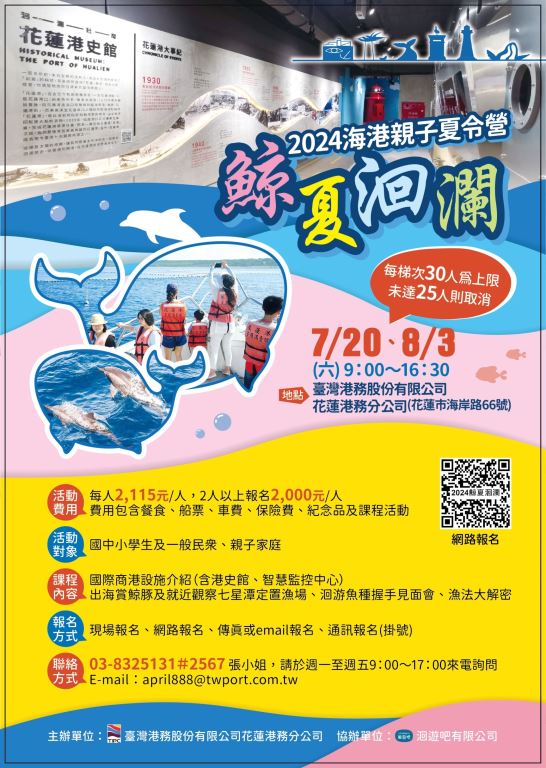 臺灣港務股份有限公司花蓮港務分公司辦理花蓮港親子夏令營暨推廣海洋教育,於113年7月20日及8月3日舉辦「海港親子夏令營-鯨夏洄瀾」活動,歡迎報名參加。