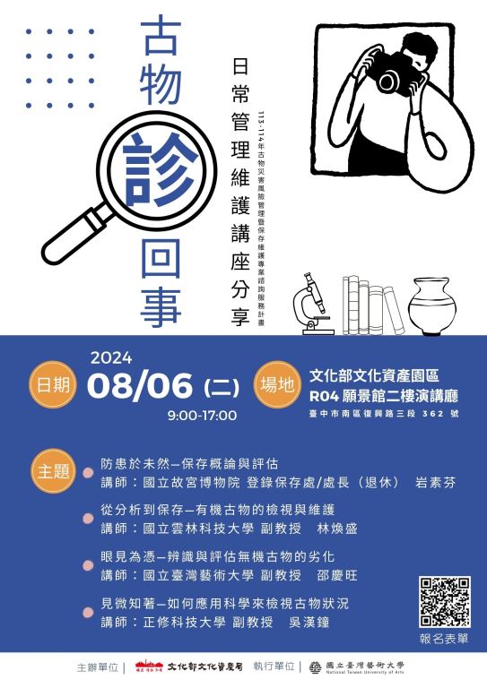 (三)講座主題:本次講座以古物日常管理維護專業知識為主軸,4個講題分別為「防患於未然—保存概論與評估」、「從分析到保存—有機古物的檢視與維護」、「眼見為憑—辨識與評估無機古物的劣化」、「見微知著—如何應用科學來檢視古物狀況」。