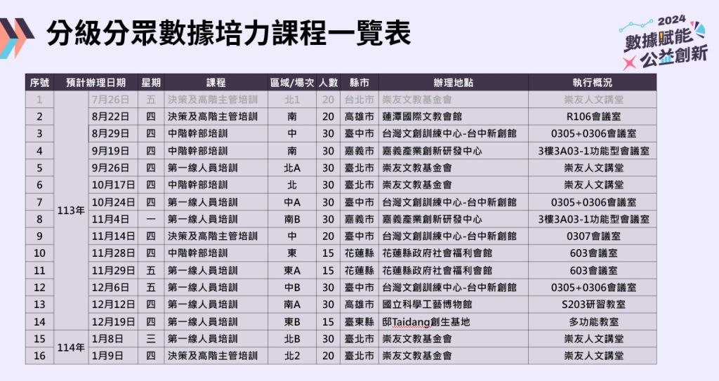 一、為鼓勵國內NGO/NPO組織活用數據並驅動發展公益創新服務,爰辦理2024「數據賦能 公益創新」專案,並開設分級分眾數據培力課程,以提升NGO/NPO組織之數據創新應用能力。