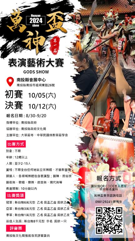 大華嚴寺及中華民國佛教華嚴學會「2024萬神嘉年華萬神盃表演藝術大賽」簡章 一、依據中華民國佛教華嚴學會113年8月6日嚴總萬神字第113080025號函辦理。 二、比賽報名方式採線上Google表單報名,網址:https://forms.gle/XKFEBkdwuKSZqd956 進入表單填寫完成報名。 三、活動聯絡人電話及信箱:宋先生0981-129241;信箱gods.carnival.hy@gmail.com。 新聞照片