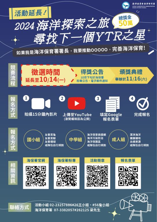 海洋委員會海洋保育署「2024海洋探索之旅尋找下一個YTR之星」海洋保育創意影音競賽報名時間延長至113年10月14日(星期一),簡章下載請參考連結,歡迎有興趣的社團、表演團體或民眾踴躍報名參與。 新聞照片