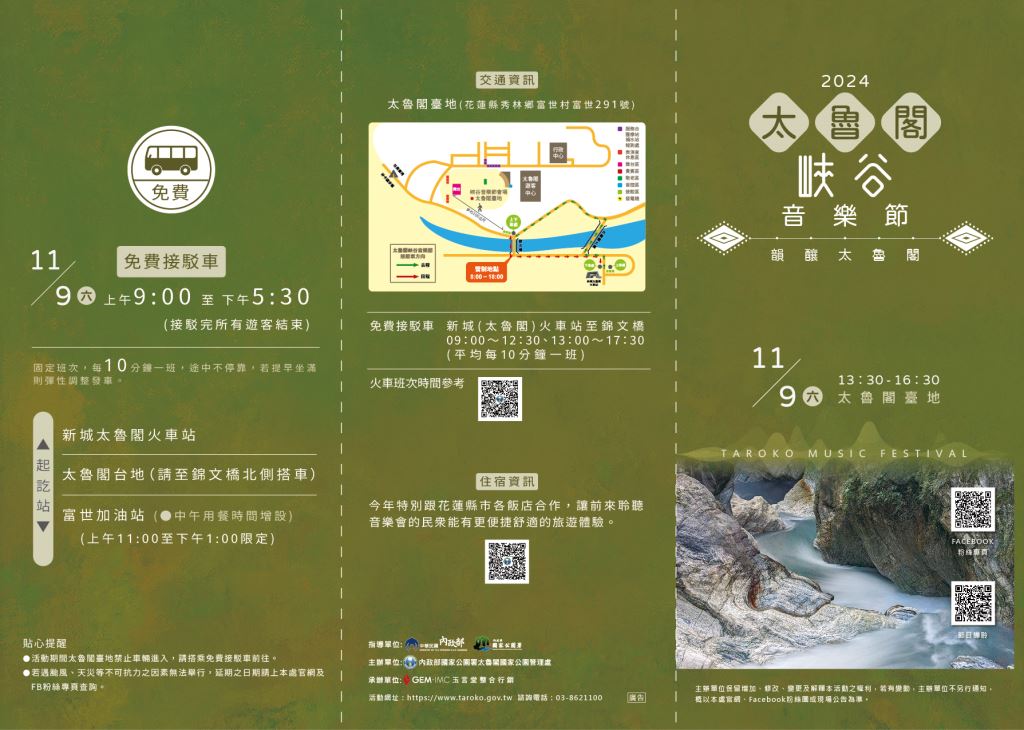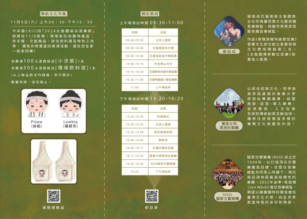 2024 太魯閣峽谷音樂節活動日期 、 時間及地點 上午市集展演: 2024年 11月 09日 (六 ) 上午 0930-下午 0430 太魯閣臺地 下午音樂會主場 演出: 2024年 11月 09日 (六 ) 下午 0130-下午 0430 太魯閣臺地 新聞照片