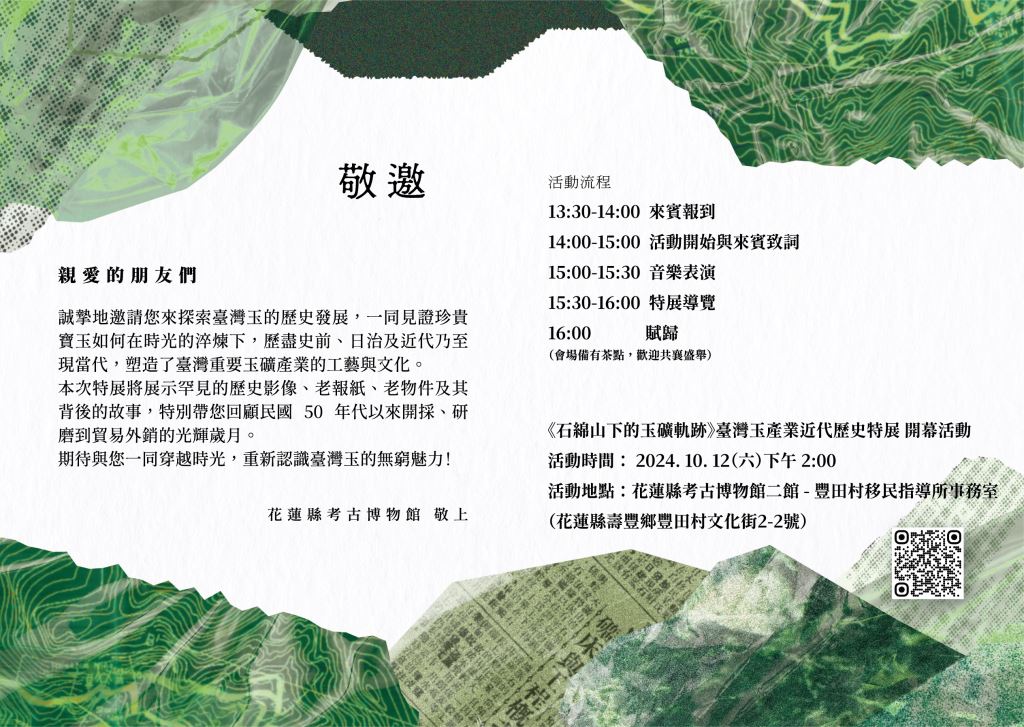 花蓮縣文化局將於113年10月12日(六)下午2點在花蓮縣考古博物館二館盛大舉辦【石綿山下的玉礦軌跡—臺灣玉近代產業歷史特展】開幕活動。本次展覽不僅是對臺灣玉產業歷史的回顧,更是一次深具意義的社區參與和在地文化保存的嘗試,展期將持續至114年6月29日(日),為期近9個月,誠摯邀請民眾共同參與這場社區文化的盛宴。