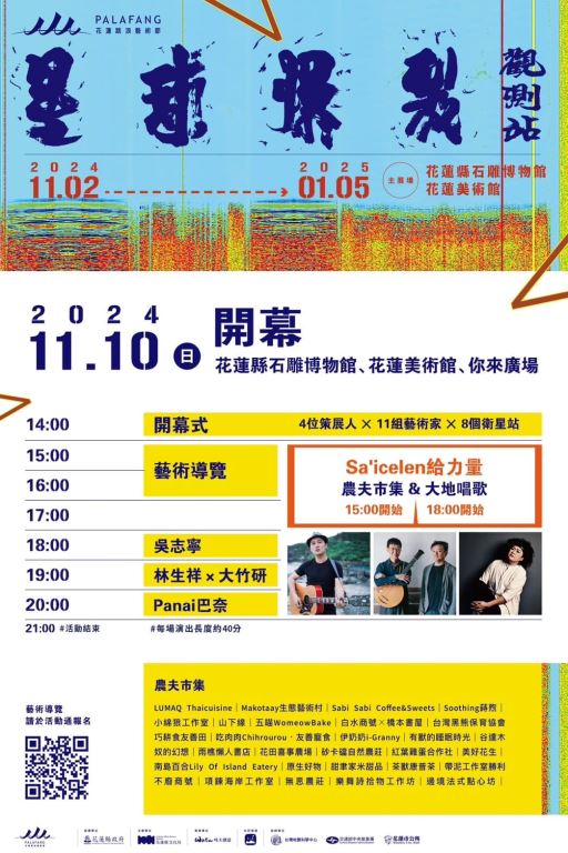 由花蓮縣文化局主辦,第三屆「PALAFANG花蓮跳浪藝術節」已於11月2日在花蓮縣石雕博物館及花蓮美術館正式開展,展至2025年1月5日止。本屆藝術節由馬國鳳、龔卓軍、Nakaw Putun、王玉萍共同策展,以「星球爆裂觀測站」為主題,集結11組藝術家、8個衛星站,呈現一系列精彩展覽及體驗活動,希望藉此創造一個療癒場所,並引導來到花蓮的旅客與在地居民共同反思人與環境的關係重組可能性。