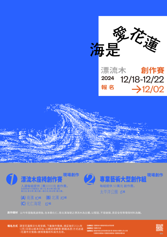 (2)《專業藝術大型創作組》:共徵選5組於太平洋公園(南北濱)現場創作,每組提供50萬元創作費。以上兩組現場創作材料皆以今年度颱風過境後,在本縣化仁海堤、南北濱海堤之堆積漂流木為主體素材,另可配搭其他複合媒材,以堅固、不易破損、具安全性等環保材料為輔,詳細徵件規定請詳閱本活動簡章。