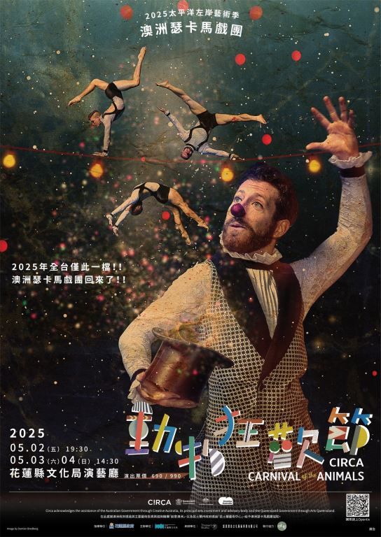 被譽為「重新定義了馬戲所能達到極限」的國際知名馬戲團隊「澳洲瑟卡馬戲團」(Circa)回來了!2024年首次登上太平洋左岸藝術季,為花蓮觀眾帶來精彩的《搗蛋鬼莫札特》;2025年,瑟卡馬戲團將帶著全面升級的作品《動物狂歡節》獨家回歸,絕妙融合古典音樂、馬戲肢體與多媒體影像,5月2日至5月4日於花蓮縣文化局演藝廳,邀請大小觀眾一同進入動物王國,享受耳目一新的劇場冒險旅程。