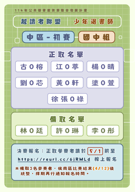 #恭賀114年少年選書師初賽中區獲獎名單出爐囉!