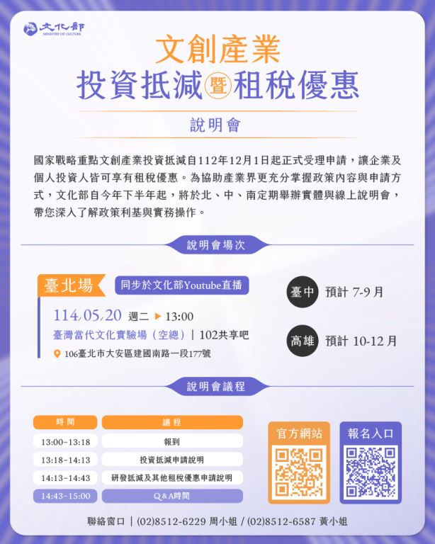 二、為協助文化創意業者及投資者了解投資抵減及相關租稅優惠之申請方式與規範,文化部將於本(114)年度起每季舉辦推廣說明會,將介紹租稅優惠內容與申請方式、作業流程與常見問題說明等相關資訊,本季第一場說明會資訊如下: