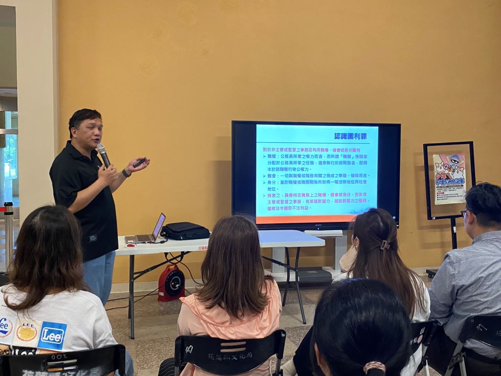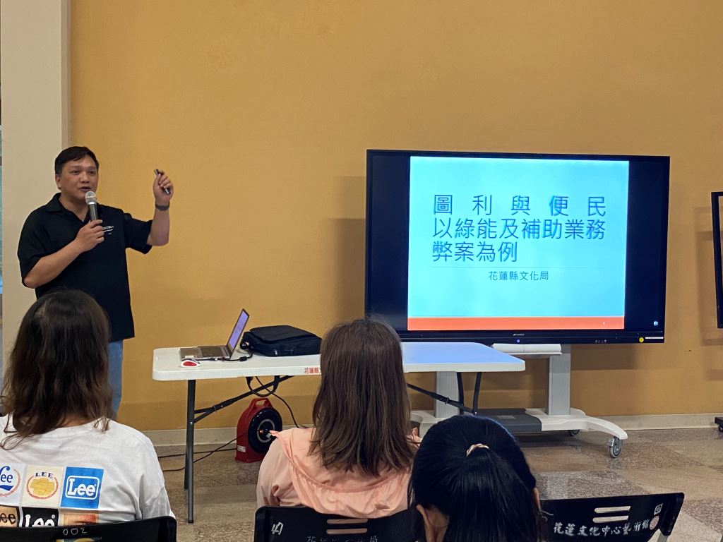 為強化機關同仁法治觀念與廉政意識,並妥適釐清公務執行中的「圖利」與「便民」界線,花蓮縣文化局於本(5)月20日舉辦「圖利與便民—以綠能及補助業務弊案為例」專案法紀宣導,由該局政風室主任賴英傑擔任講座,針對機關相關作業彙整相關案例量身訂做宣導教材。