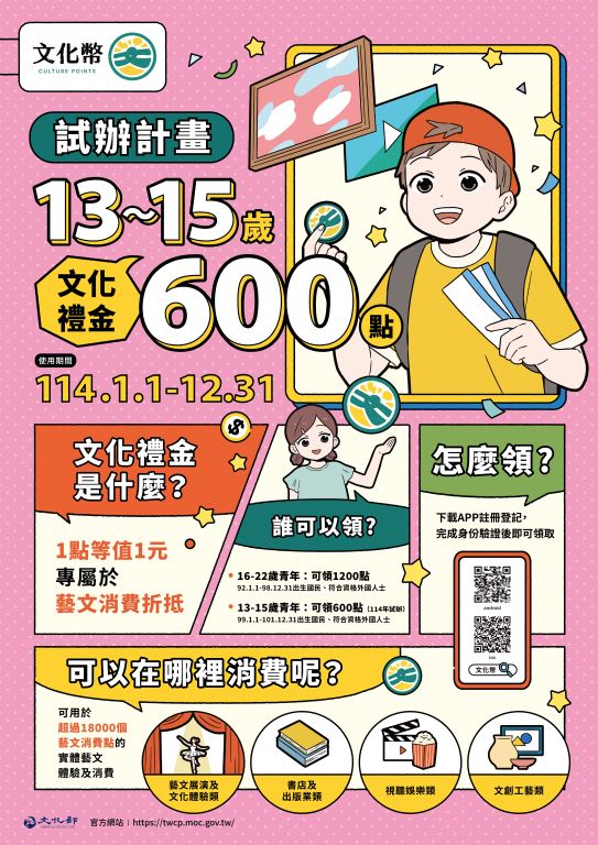 文化部自112年起發放文化禮金,113年常態化發放,並擴大對象為16-22歲,每人領取文化幣1200點。 為讓文化向下扎根,114年起,除了維持原發放,加碼推出13-15歲試辦計畫,每人發給600點,也就是從國中起就能透過文化幣進行藝文體驗。 文化部表示,文化禮金,可使用於看國片、看表演、買書、逛博物館、手作DIY或文化體驗旅程等藝文體驗及消費,114年領取之文化禮金使用期限至114年12月31日止, 歡迎13-22歲青少年領取使用。 附件檔案 懶人包(.pdf) 相關連結 文化部文化幣 新聞照片