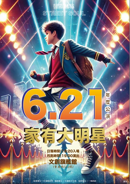 由花蓮縣政府指導,花蓮縣文化局補助街頭靈魂舞蹈團,將於6月21日晚上7點在花蓮文創旗艦館演出《2025【家有大明星】年度公演》,街頭靈魂舞蹈團申請表演藝術補助活動,提案以創新舞台劇形式進行演出,將融合戲劇結構與舞蹈編排,從舞蹈家的視角出發,深刻描繪花蓮表演藝術人才在現實與理想之間堅持創作的生命歷程。最令人動容的是,本次演出橫跨5歲至65歲的年齡層,呈現出一場世代共舞、跨界共感的藝術饗宴,表演者不乏在花蓮堅持創作的藝術工作者,他們在兼職工作、家庭與現實生活壓力之下,仍以舞蹈為志業,訴說自己對藝術的熱情與信仰。