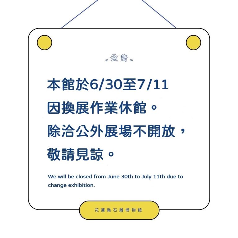 花蓮縣石雕博物館休館公告 本館於6/30-7/11因換展作業休館,除洽公外暫不對外開放。 新展預告(7/12~9/21) 流與留 穿越娑婆之巔 ─ 李紫晴個展 Aluaiy的嫁妝 ─ 武玉玲個展 新聞照片