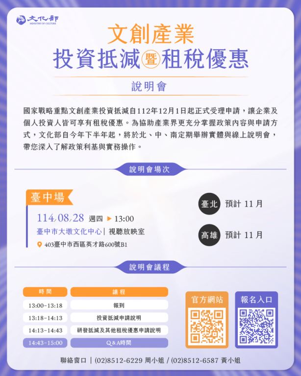 為協助文化創意業者及投資者了解投資抵減及相關租稅優惠之申請方式與規範,文化部於本(114)年度起每季舉辦推廣說明會,介紹租稅優惠內容與申請方式、作業流程與常見問題說明等相關資訊,第三季第一場說明會資訊如下:
