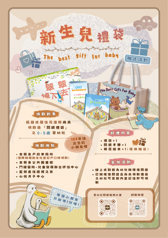 - 新生兒辦理登記時同時辦理閱覽即可領取1份「閱讀禮袋」。