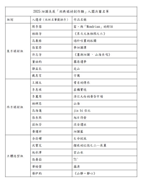 2025洄瀾美展「經典媒材創作類」入圍決審名單公告