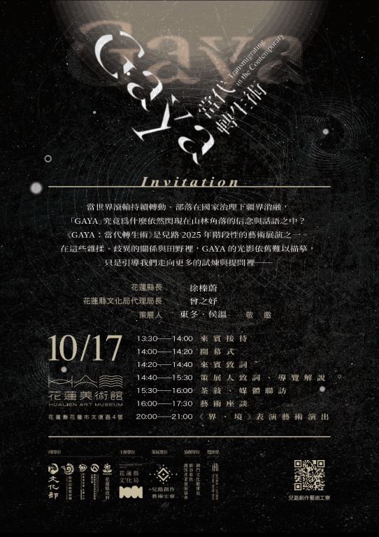 由花蓮縣文化局主辦、兒路創作藝術工寮策劃《Gaya:當代轉生術》,將於2025年10月17日下午2時於花蓮美術館(花蓮市文復路4號)開幕,當日下午4時為座談、晚間8時則有《界.境》動態展演。展覽將持續展出至11月30日。本展聚集13位藝術家,透過裝置、雕塑、跨域媒材與現地創作,回應太魯閣族核心文化價值「GAYA」在當代部落社會的存在與轉生。