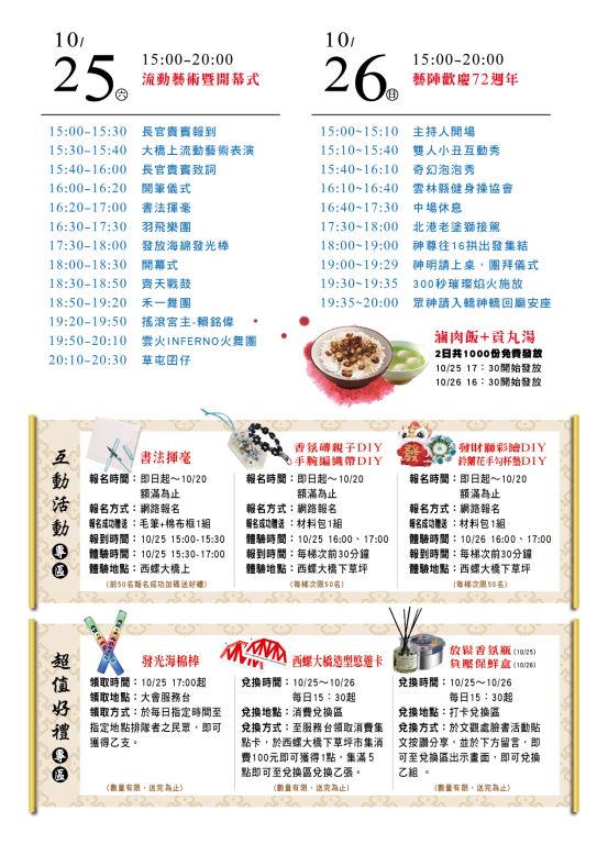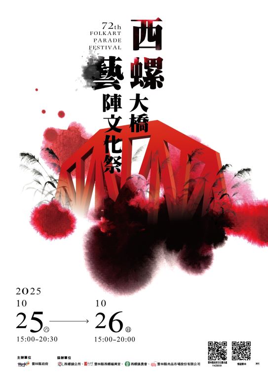 雲林縣政府府訂於114年10月25日至26日假西螺大橋舉行「2025西螺大橋藝陣文化祭」活動 旨揭10月25日(六)至10月26日(日)下午3時至晚間8時舉行,於現場舉辦書法揮毫、藝陣表演、300秒高空焰火秀與市集活動,歡迎參加。 新聞照片