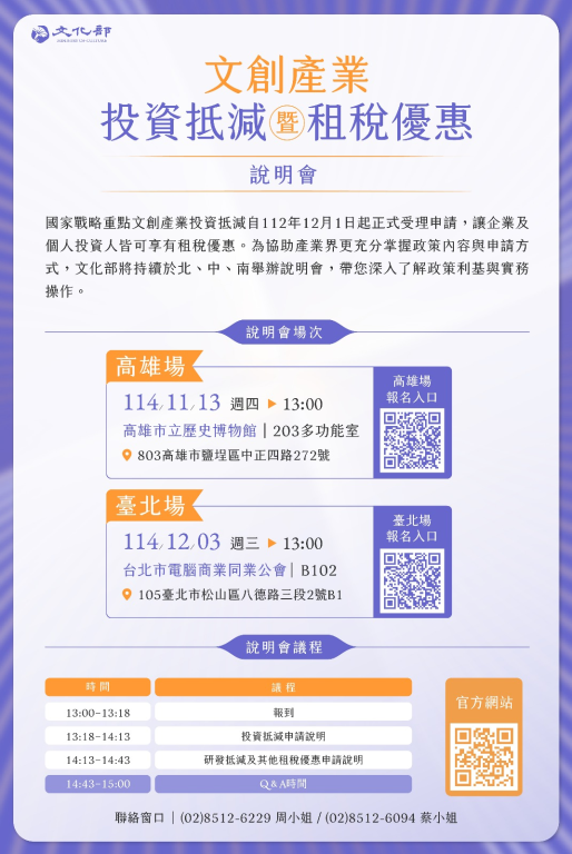 二、為協助文化創意業者及投資者了解投資抵減及相關租稅優惠之申請方式與規範,文化部於本(114)年度起每季舉辦推廣說明會,介紹租稅優惠內容與申請方式、作業流程與常見問題說明等相關資訊,第四季說明會資訊如下: