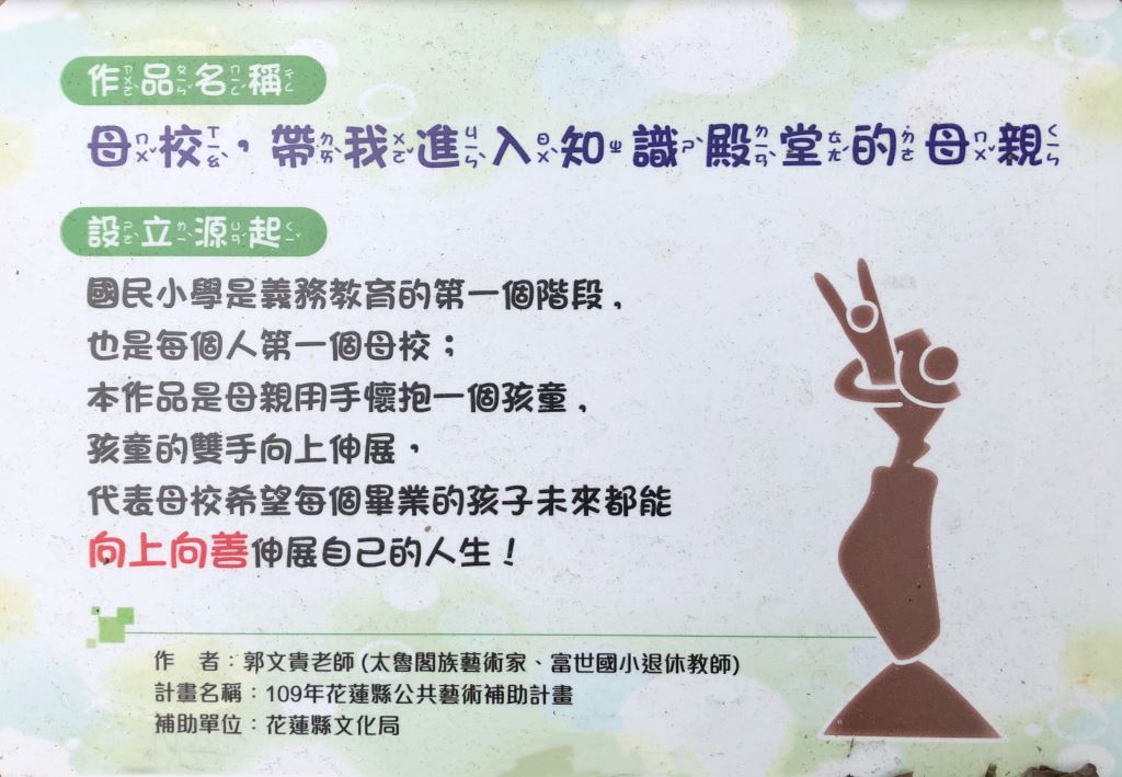 「母校,帶我進入知識殿堂的母親!」位於秀林鄉崇德國中校區內。校園空間是學生的第三位老師(首位老師是同儕,居次的是學校老師)。環境也是潛在課程的一部分,它為學生帶來的是潛移默化的影響。師生透過實體欣賞藝術作品,達到美感教育的養成,也建立對母校感恩的情懷。 所在位置 地址 972 花蓮縣秀林鄉72號 其他資料 經費 260000 委託單位 花蓮縣文化局 取得方式 公開徵選