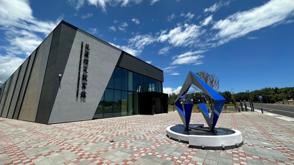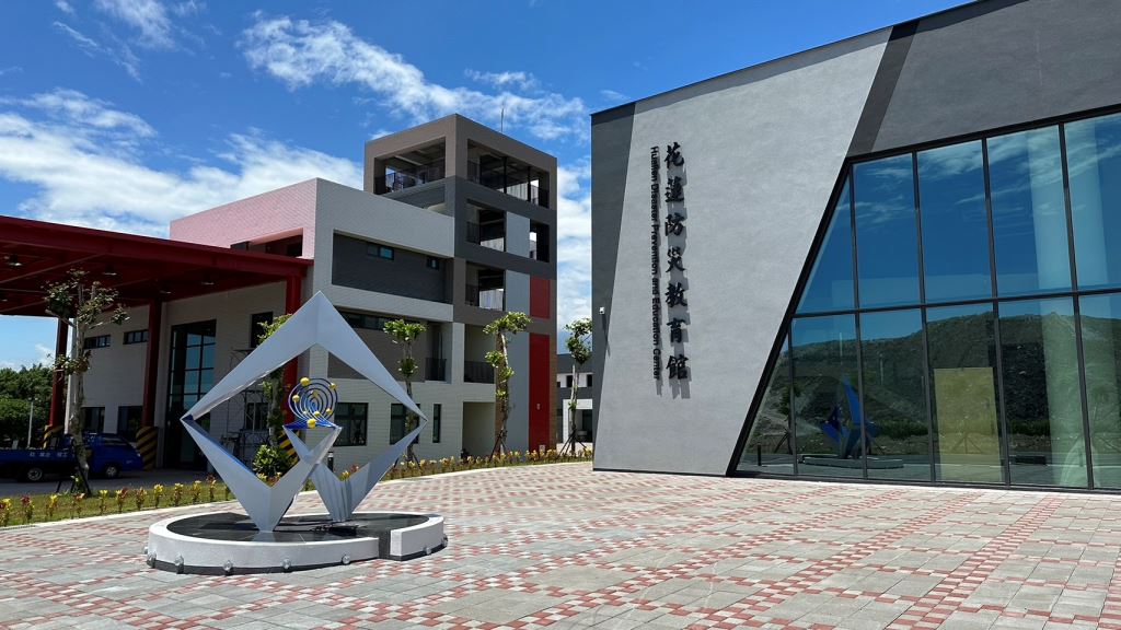 作品說明:作品以自然環境為出發,傳達人與自然的防災守護觀念。在面對天然災害前,去做出應變的準備,在日常中建立對天然災害防治的觀念,讓防災成為幸福家園的一種守護力量,如同【洄】作品所要呈現「 平安家園」的概念。作品幾何立體的折線與防災教育館外觀的線條呼應,在作品中間的交岔地帶,加入海潮元素,呼應兩個板塊與海洋之間的自然關係。海潮部分用鋼管線性構成流動所交織的空間。線性中加入圓球,圓球在此代表千千萬萬的自然生命,形成了大地與自然共生的生命體。作品下方燈光加入了地震波感應,當地震來時接收信號,底層的燈會由藍色轉為紅色閃爍 。