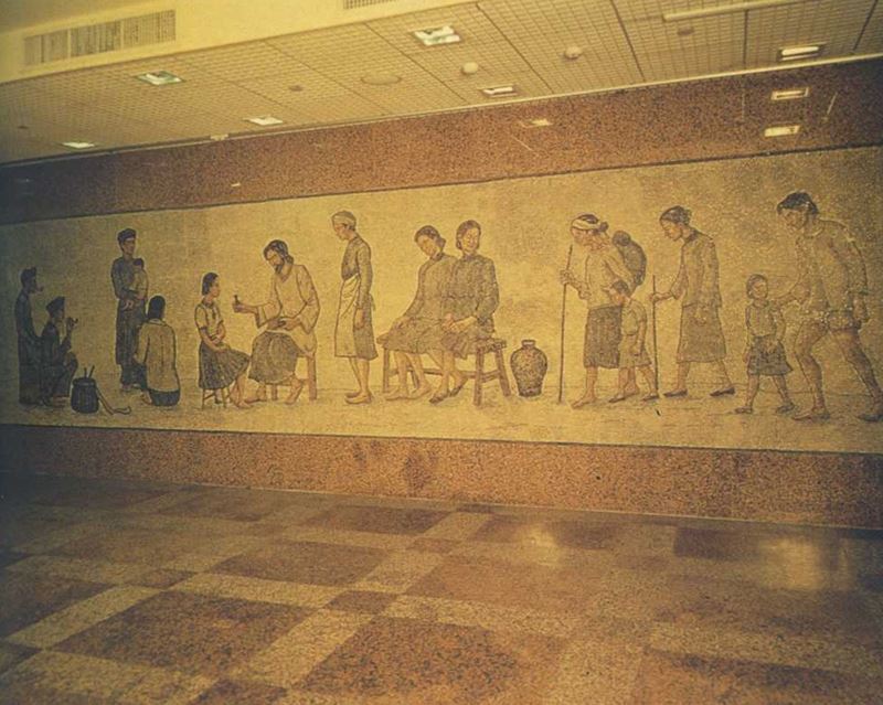 由陳景容教授繪製的草圖,嚴格遵守古典風格,將耶穌化身醫生,為原住民醫療治病的景象,仔細描繪。再經簡源忠把大約二十萬片的原石切割、鑲嵌、安裝在醫院牆面。此作的尺幅巨大 ,做工細緻,花費的材料、人工十分艱鉅,是台灣美術界罕見的古典風格的馬賽克藝 所在位置 地址 970 花蓮縣花蓮市門諾醫院住院大樓 其他資料 委託單位 基督教門諾醫院 取得方式 公開徵選