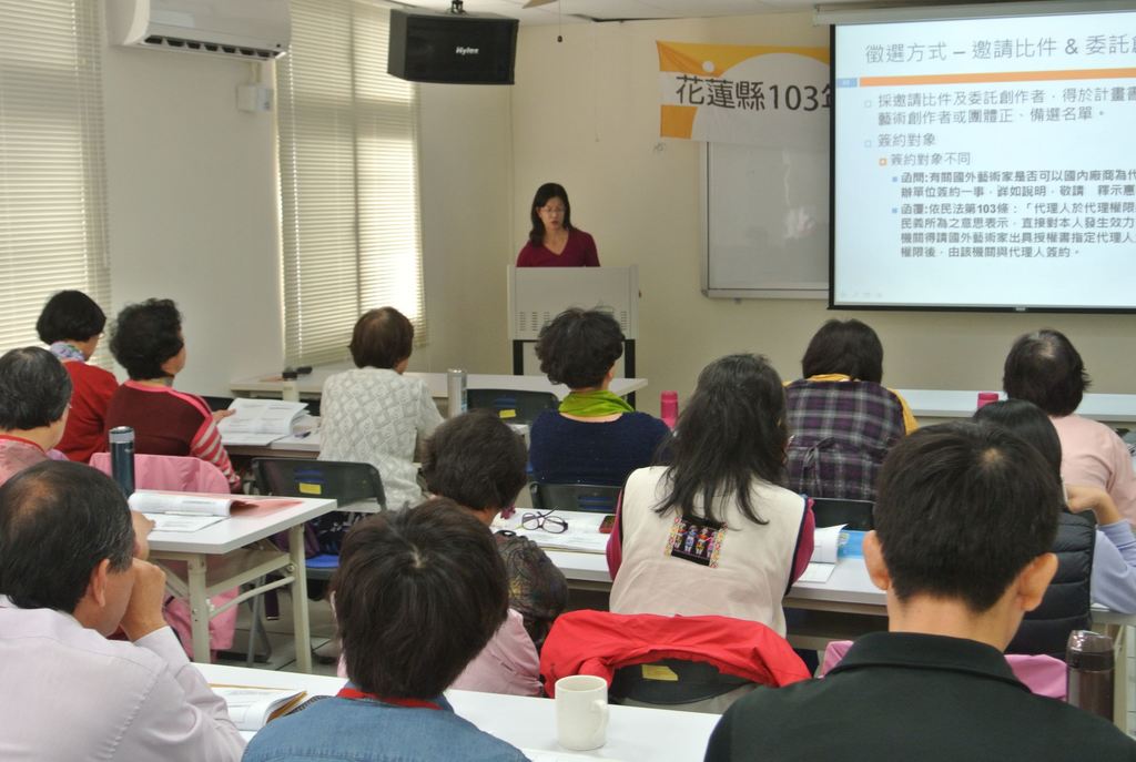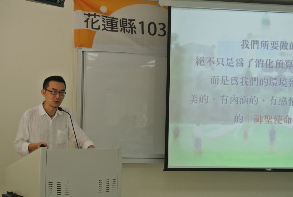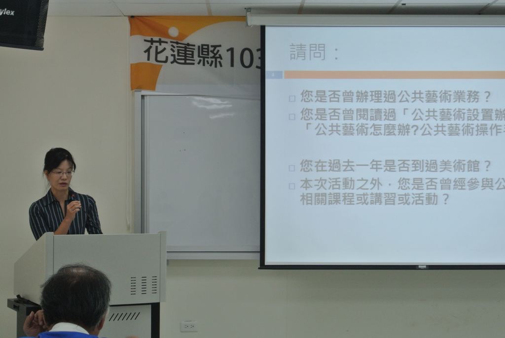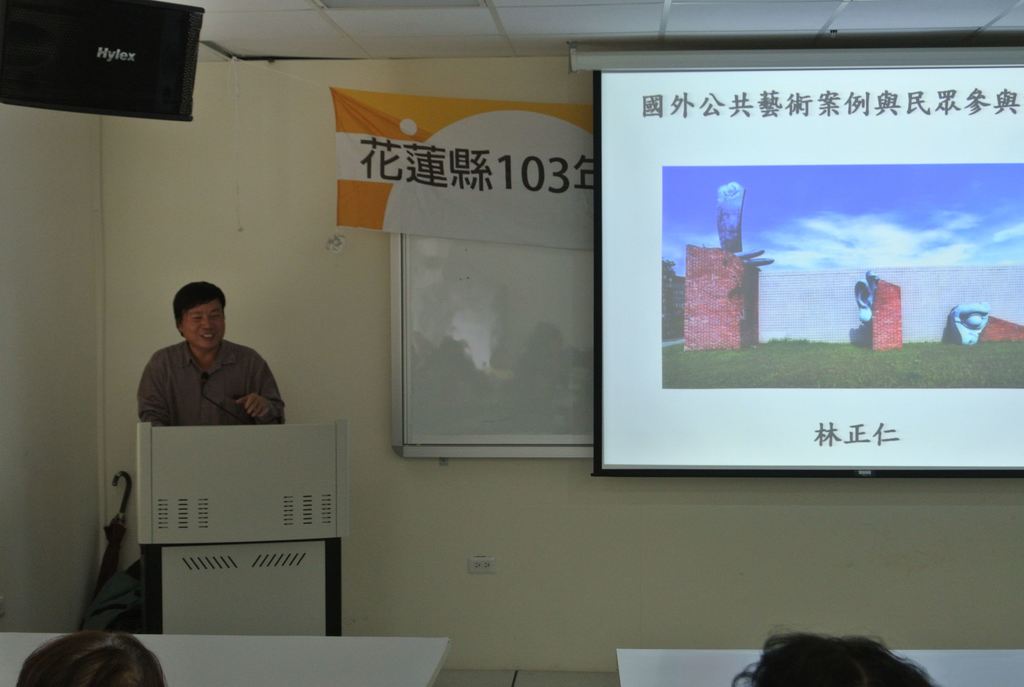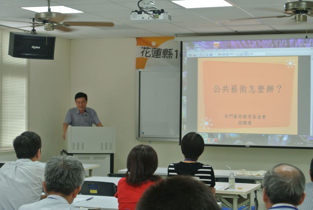 第一場特別邀請帝門藝術教育基金會執行長熊鵬翥、蔚龍藝術有限公司經理劉瑞如、開放空間文教基金會執行長黃浩德及東華大學藝術學院院長潘小雪院長,分別主講「公共藝術怎麼辦?」、「公共藝術教戰實務」、「公共藝術新美學與民眾參與」及「本縣公共藝術案例分享」等課程,期盼未來本縣公共藝術業務推展順利,創造本縣更優質的藝術環境。
