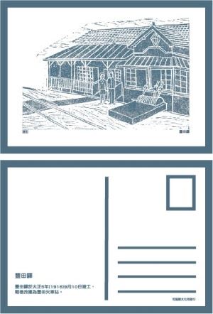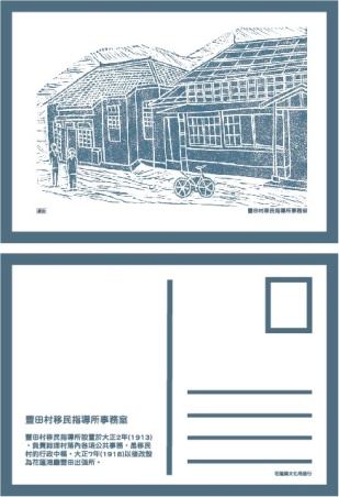 四、辦理過程 (一)禮堂講台布幕製作(106.9.21-11.24):設計者王力之小姐設計圖稿,經豐裡國小學校校長、 主任提供審查意見,並經一致同意後輸出懸掛。 (二)明信片製作(106.11.25):設計者王力之小姐挑選日治時期移民村建築5處老照片,包括菸 樓、警察官吏派出所、豐裡國小禮堂、豐田驛站、移民指導所,以膠板刻印為圖稿,印刷1套 5張,計1,000份。