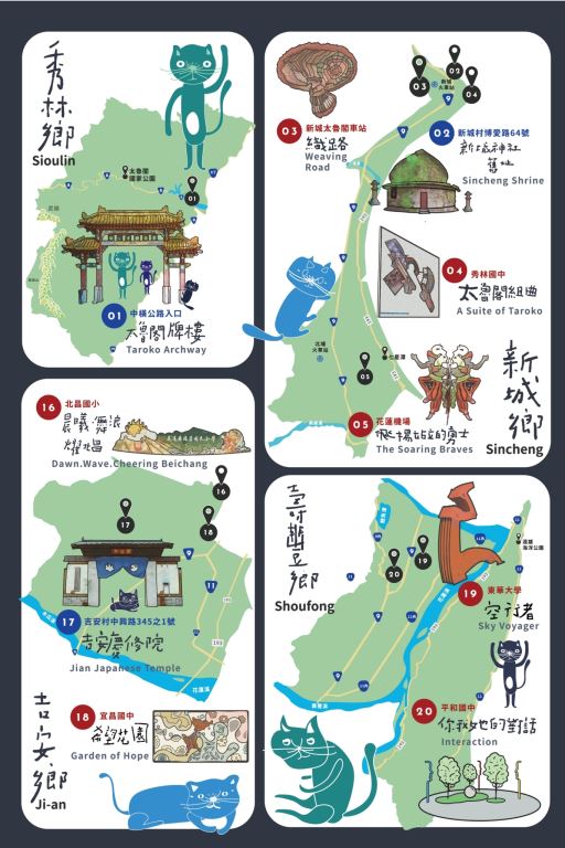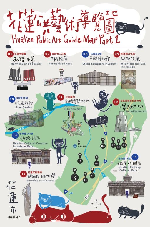 我們的城鄉既有百多件公共藝術作品設置在我們生活的週遭,這些藝術品多年來默默地為我們的生活提升了實質的美感,並為特定的公共空間注入了無可言說的藝術氛圍。為讓鄉親及旅客認識花蓮的城市藝文面貌,花蓮縣文化局精挑13件公共藝術作品、7個文化景點,共計20個點進行編印「花蓮藝術導覽地圖part I」,邀請清新文青風格插畫家陳怡玟繪製,首波推出本縣北區(花蓮市、秀林鄉、新城鄉、吉安鄉及壽豐鄉等地)公共藝術作品及藝文景點,增添遊客到訪花蓮時的趣味性,提供鄉親及旅客藝文漫遊的最佳工具。