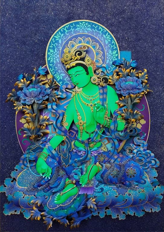 紙雕藝術品,以鮮豔色彩呈現怒相佛像,周圍環繞龍形圖案