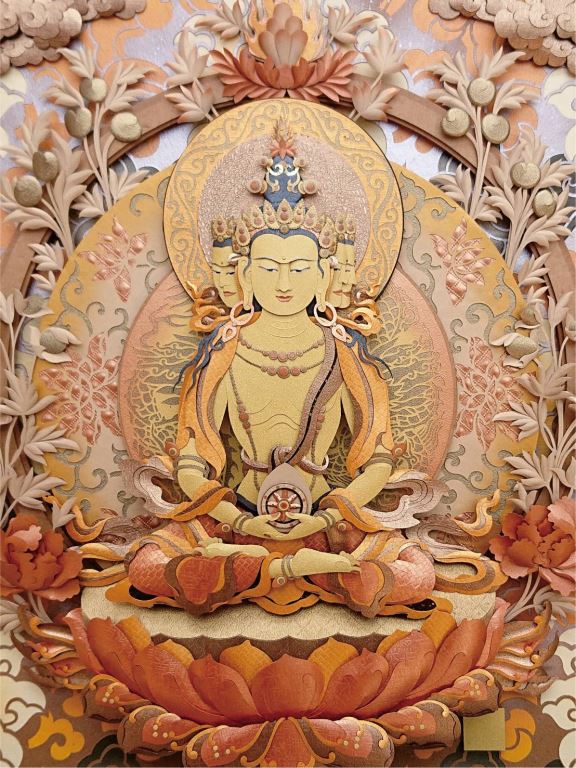 紙雕藝術品,呈現多面佛像端坐於蓮花寶座上