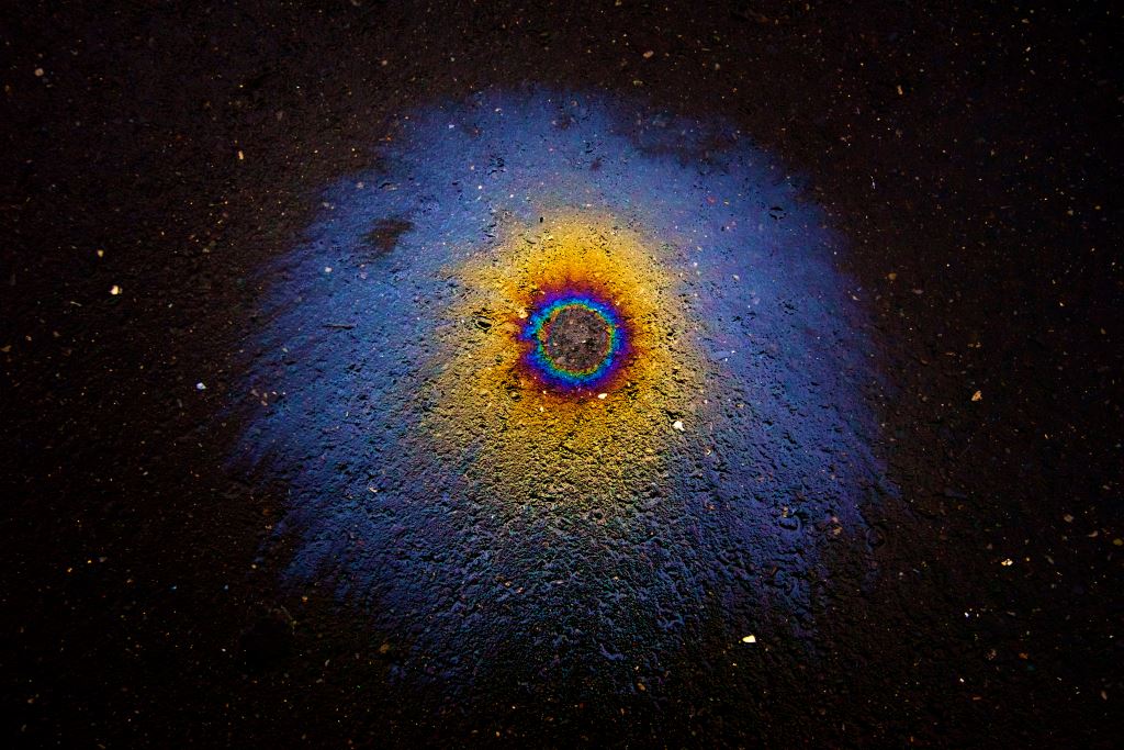 路面油漬形成彩虹光暈,色彩繽紛