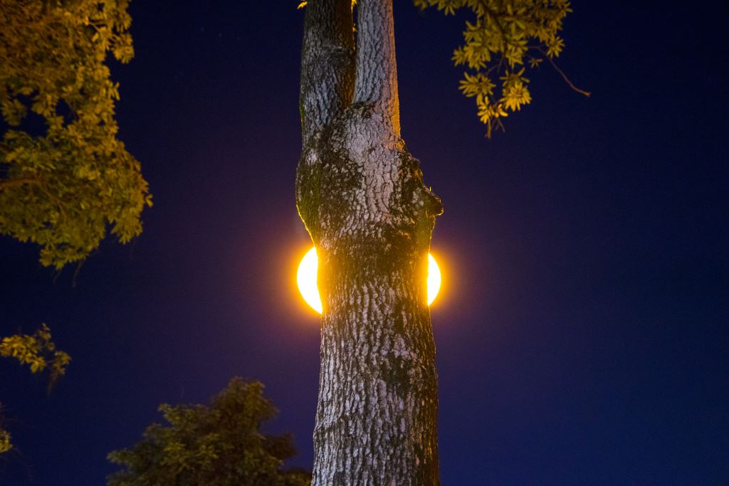 夜晚樹木後方發出亮光,呈現奇特的光影效果
