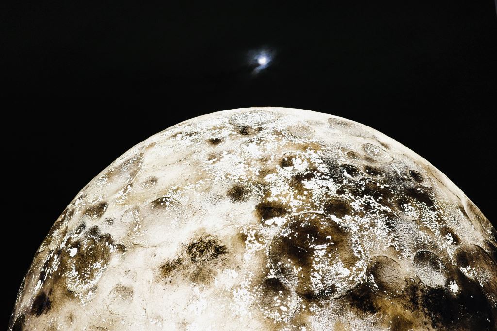 巨大球體表面凹凸不平,上方一輪明月在夜空中閃耀