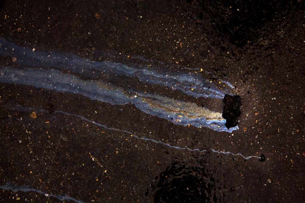 路面上的油漬形成流線型彩虹光澤,在黑色柏油路上延伸