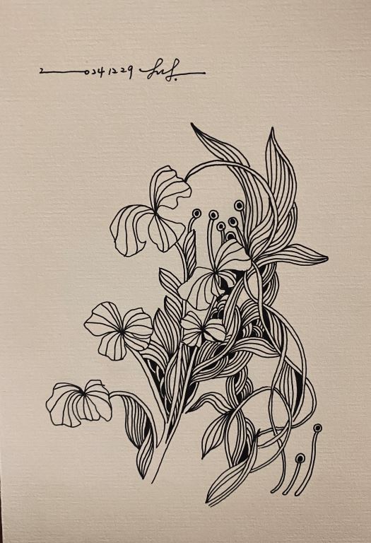 線稿描繪花朵與枝葉的抽象構圖