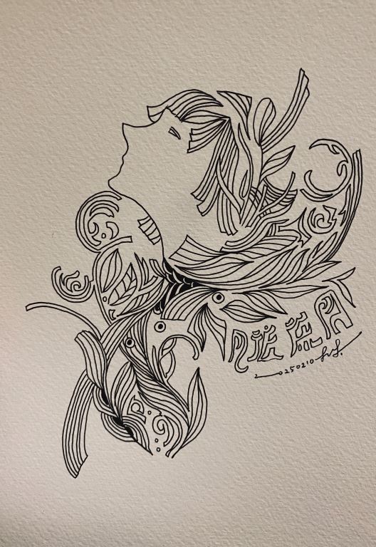 以線稿描繪女性側面頭像,植物環繞