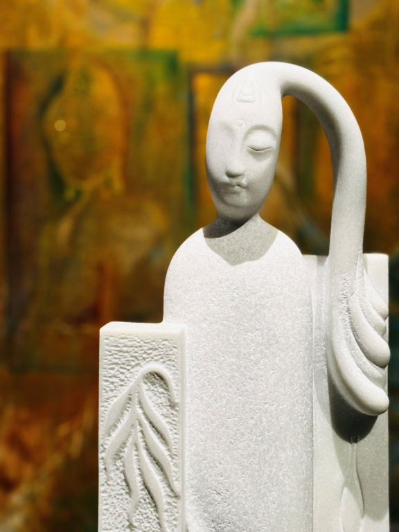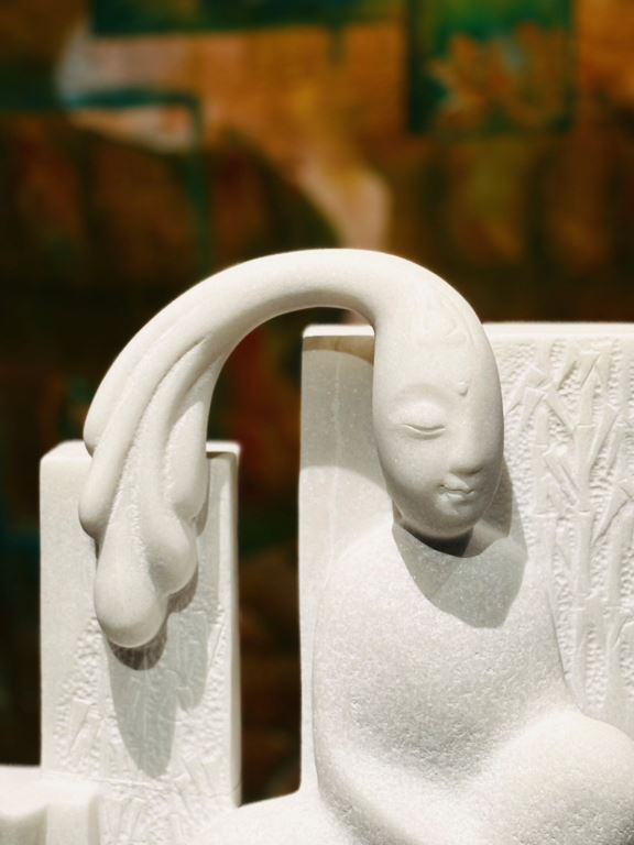 白色石雕作品的特寫,人物面容靜謐