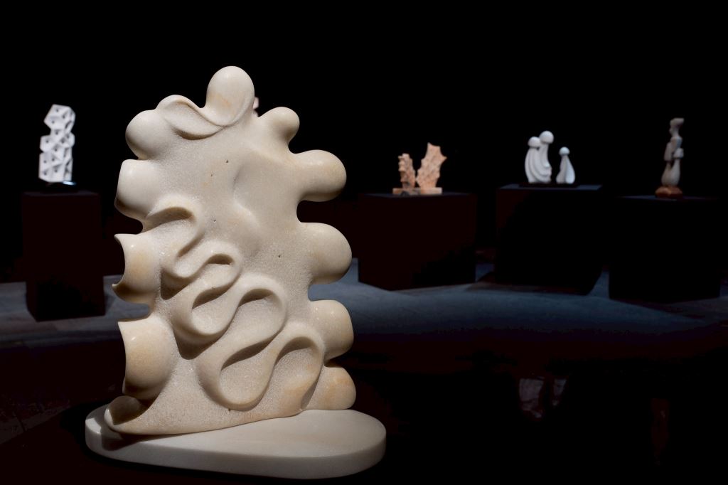 一件白色大理石的抽象雕塑,有著流動起伏的有機線條