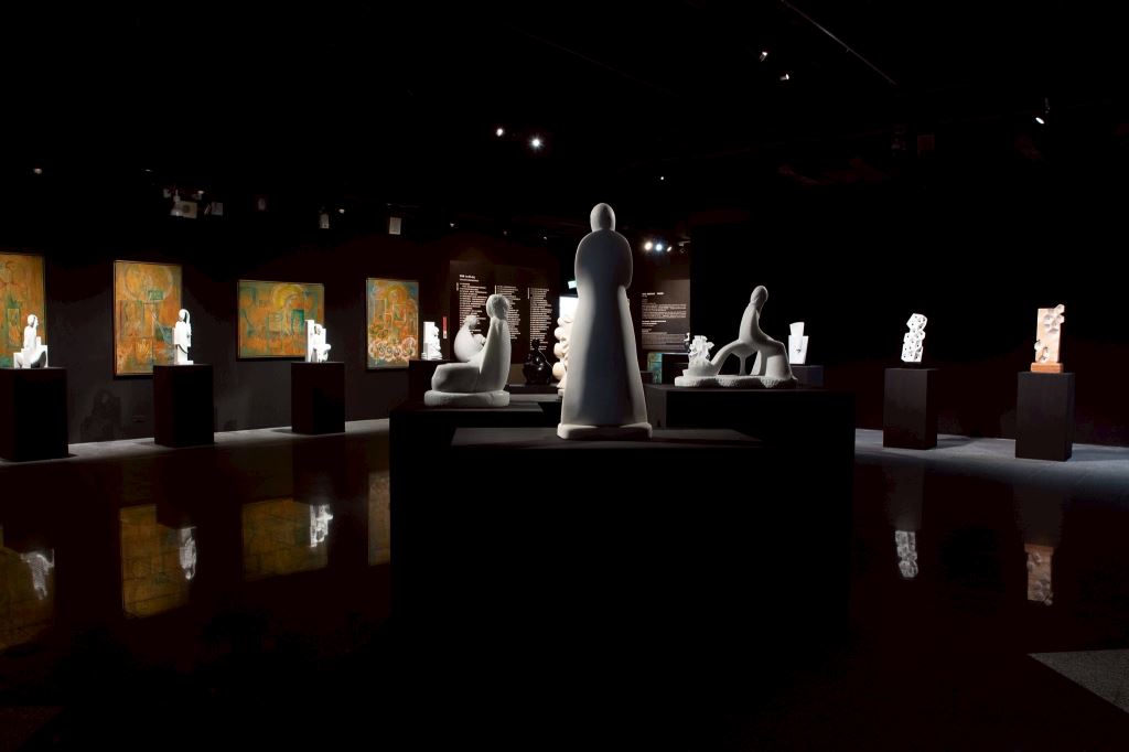 多件雕塑作品陳列於昏暗的展廳中